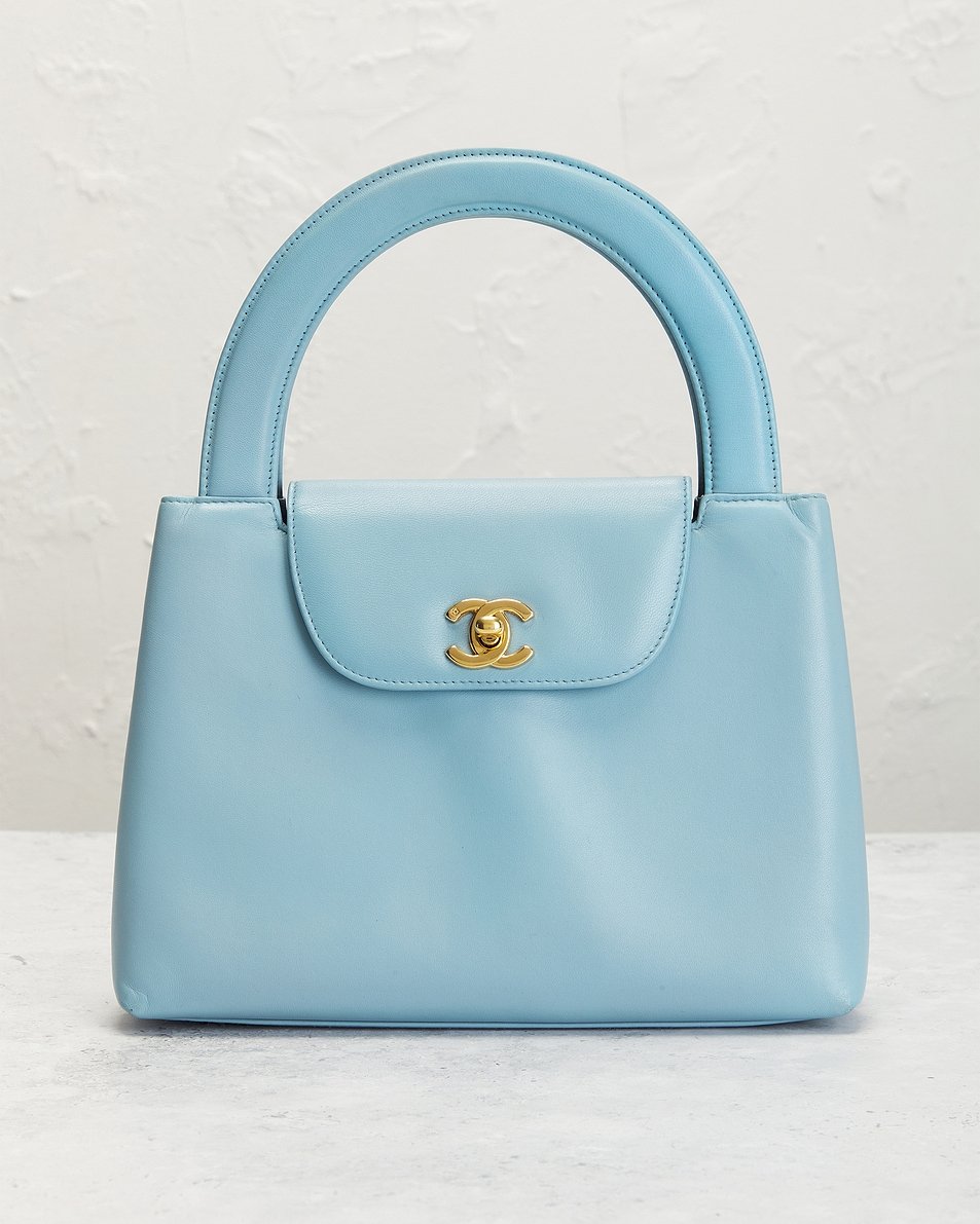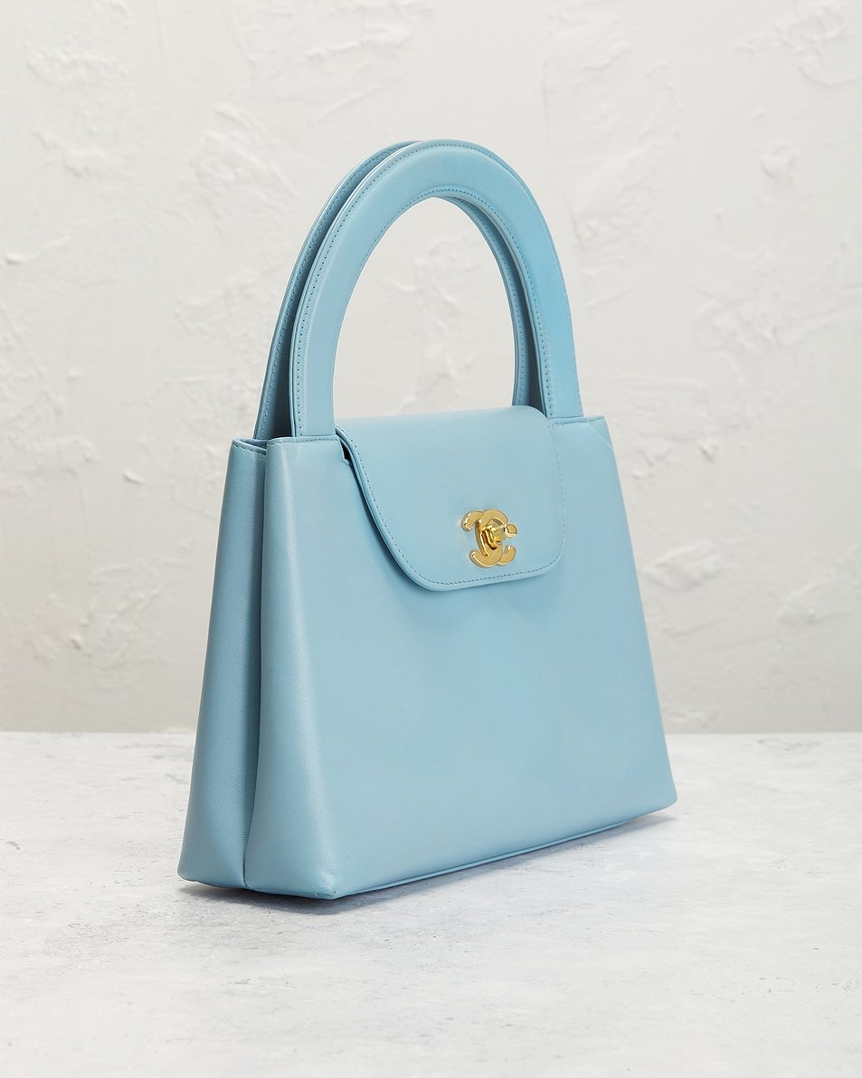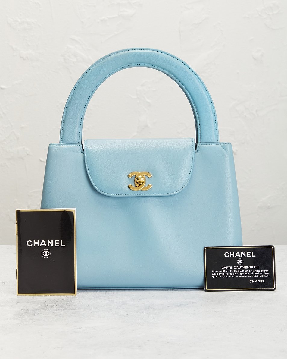 - Blue lambskin leather exterior with gold-tone hardware and leather lining