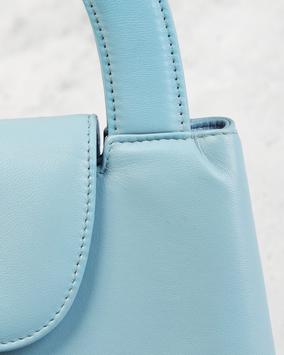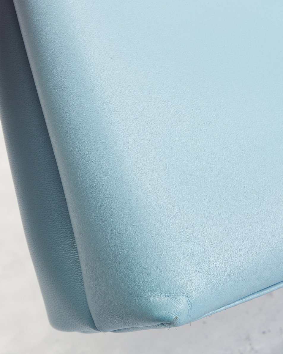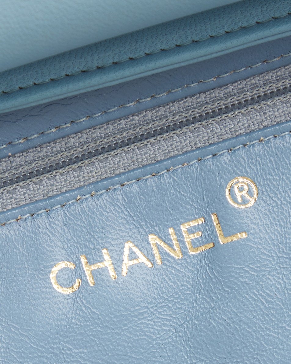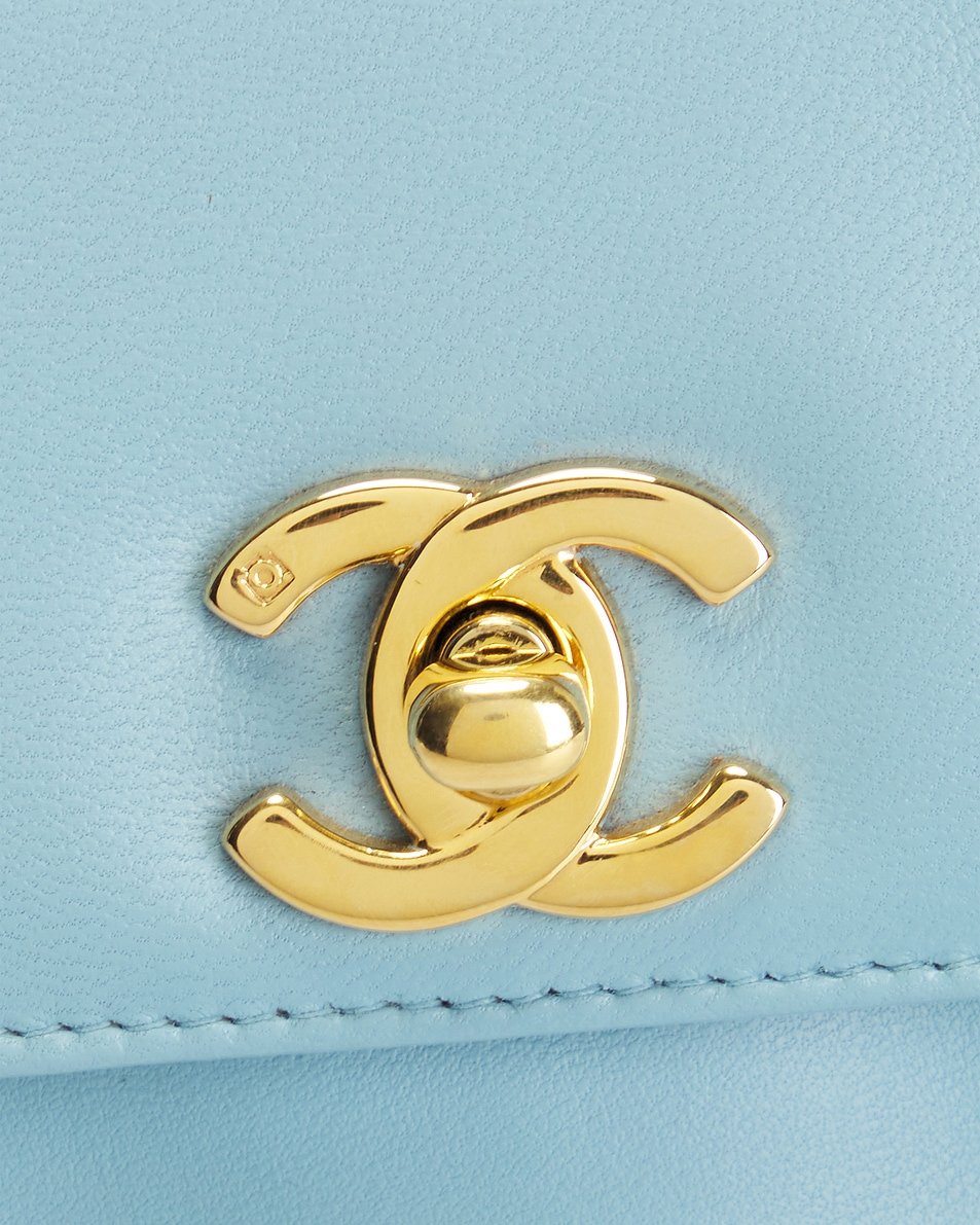- Blue lambskin leather exterior with gold-tone hardware and leather lining