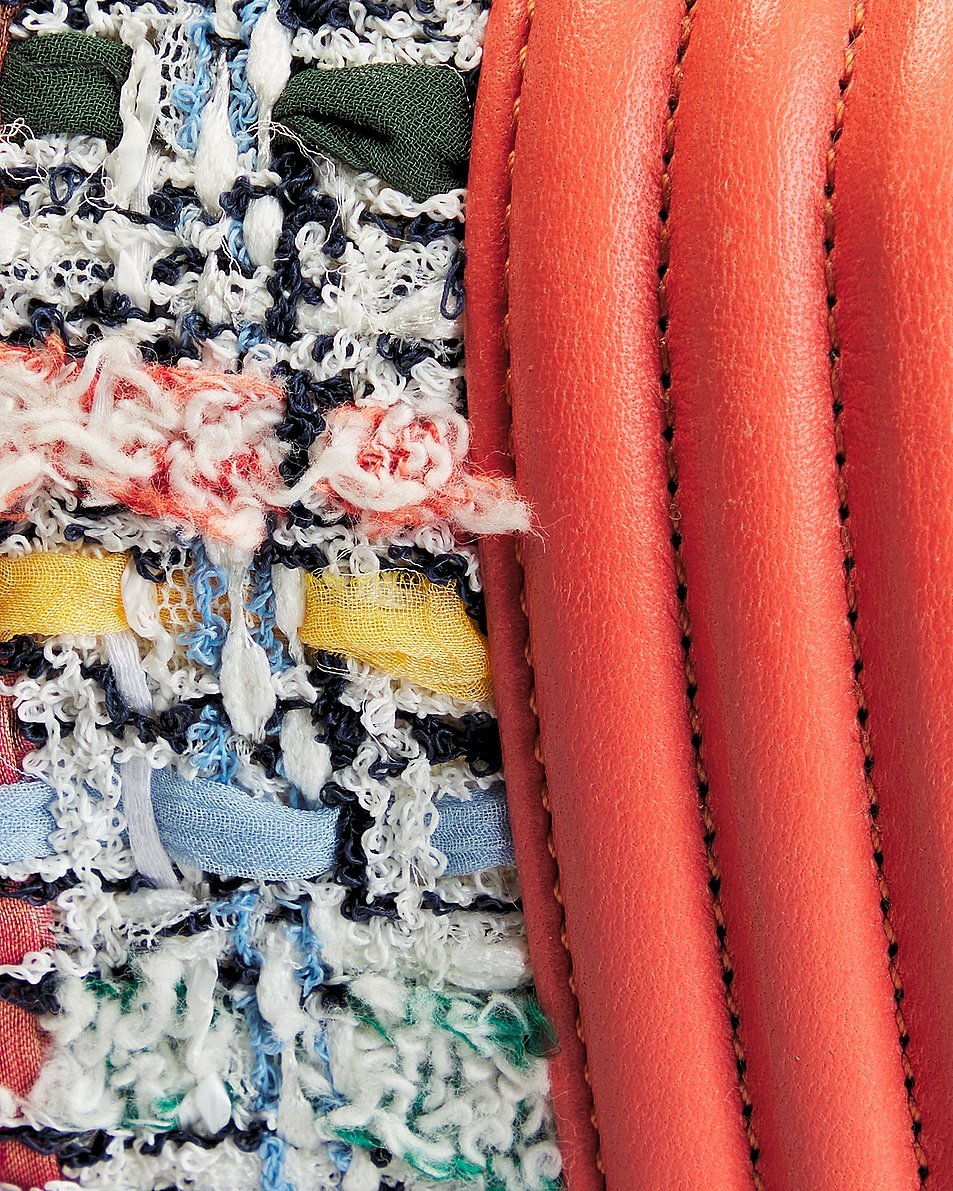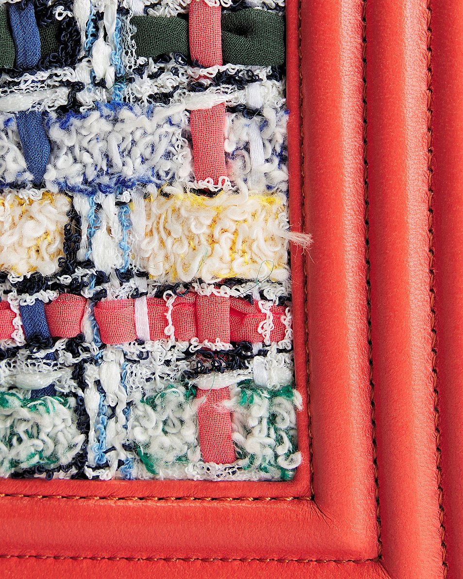 • Tweed and calfskin exterior with twill lining