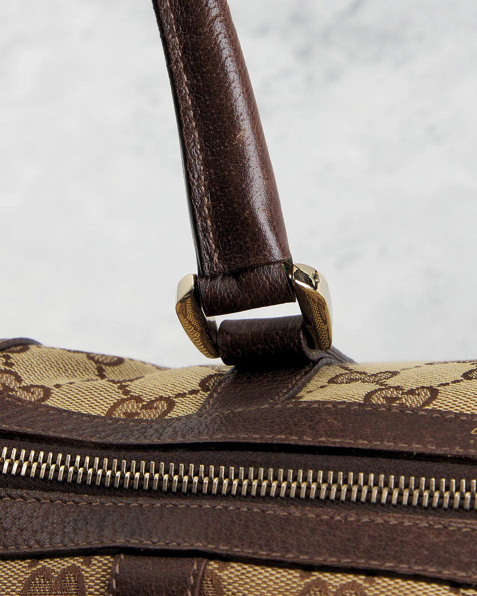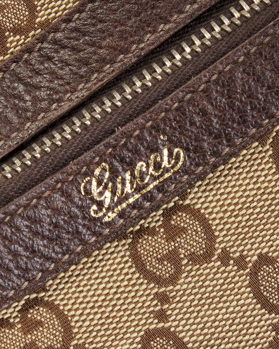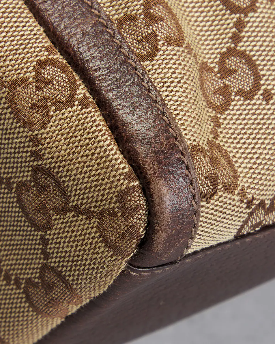 - Canvas exterior with textile lining, calfskin leather trim, and gold-tone hardware