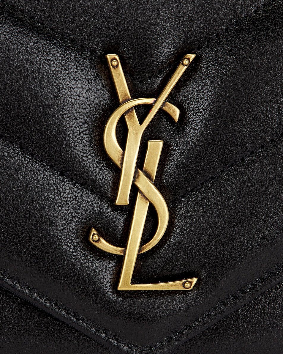 • “Y” matelassé lambskin exterior with grosgrain lining and antique gold-tone hardware
